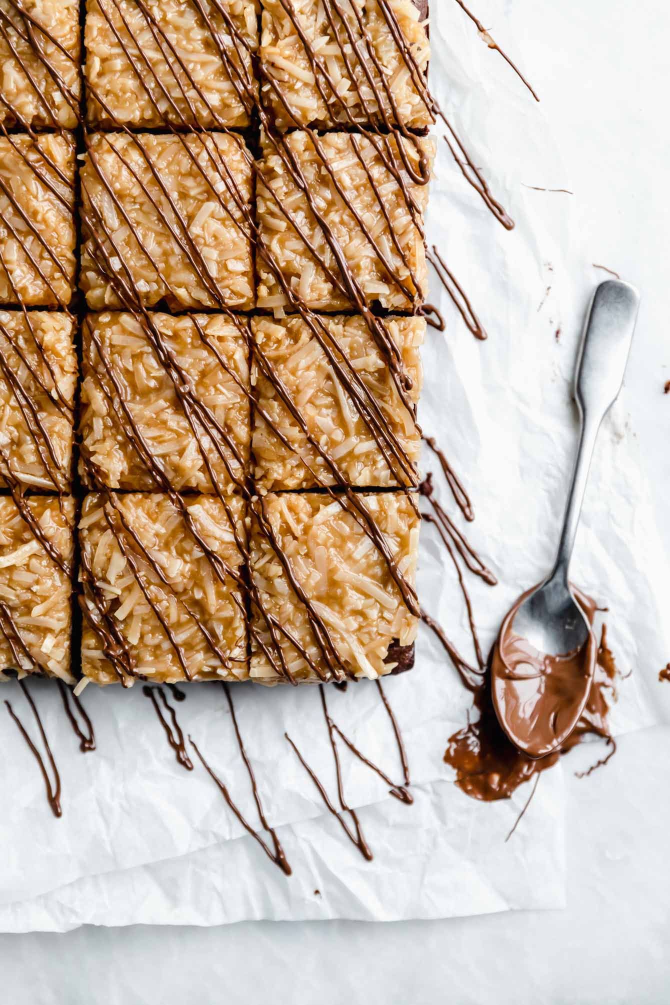 7. Spoon melted chocolate into a small ziplock bag, creating a makeshift pastry bag. Cut a small (tiny!) slit at the bottom corner of the bag. Drizzle the melted chocolate over the coconut caramel. Set in the fridge to cool for about 1 hour. Cut into 9 brownies and serve!