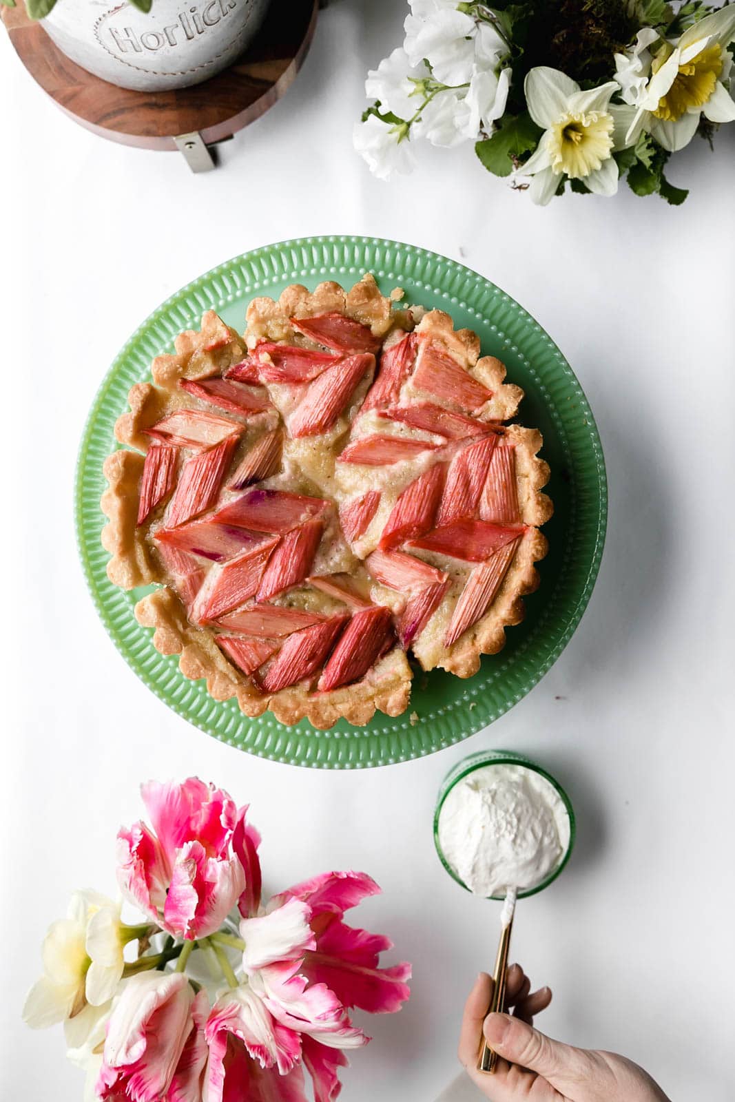 Not going to lie I’ve made this tart 2 times already and I’m ready to make it again stat. While it does have a lot of steps, it’s surprisingly easy to put together, and doesn’t require much technique beyond placing the rhubarb in a herringbone pattern on top. So don’t be put off if you’re not an experienced baker– you got this!!