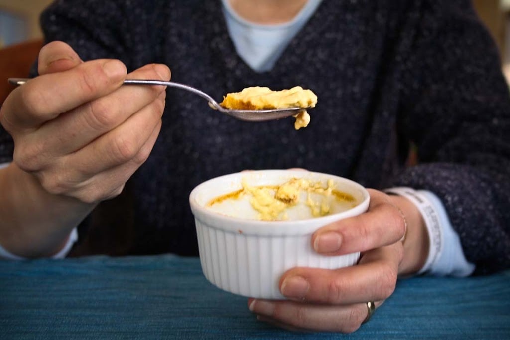 - Preheat the oven to 320°F. Place four small-medium ramekins into a small roasting tray. Put the kettle on to boil. Chop the pod into 1/2 inch chunks with a knife or scissors. Put in the bowl of a food processor along with the rest of the ingredients. Blend until the pod seems finely chopped and the seeds are distributed throughout the mixture. Pour through a sieve into a jug. Pour into 4 small ramekins, working to evenly distribute between them. Place the tray into the oven and pour hot water from the kettle into the roasting tray carefully up to 1/2 way up the sides, avoiding it splashing into the ramekins.