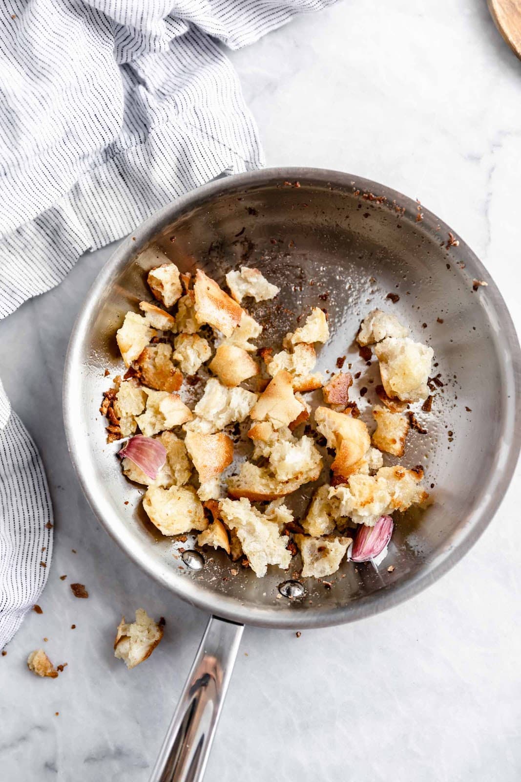- Place a small saucepan over medium heat. Add in 1 tablespoon of olive oil and 2 cloves of crushed garlic (skins still on). Saute for 1 minute, then add in baguette pieces, tossing to coat. Cook until golden brown, then remove from heat and allow to cool slightly.