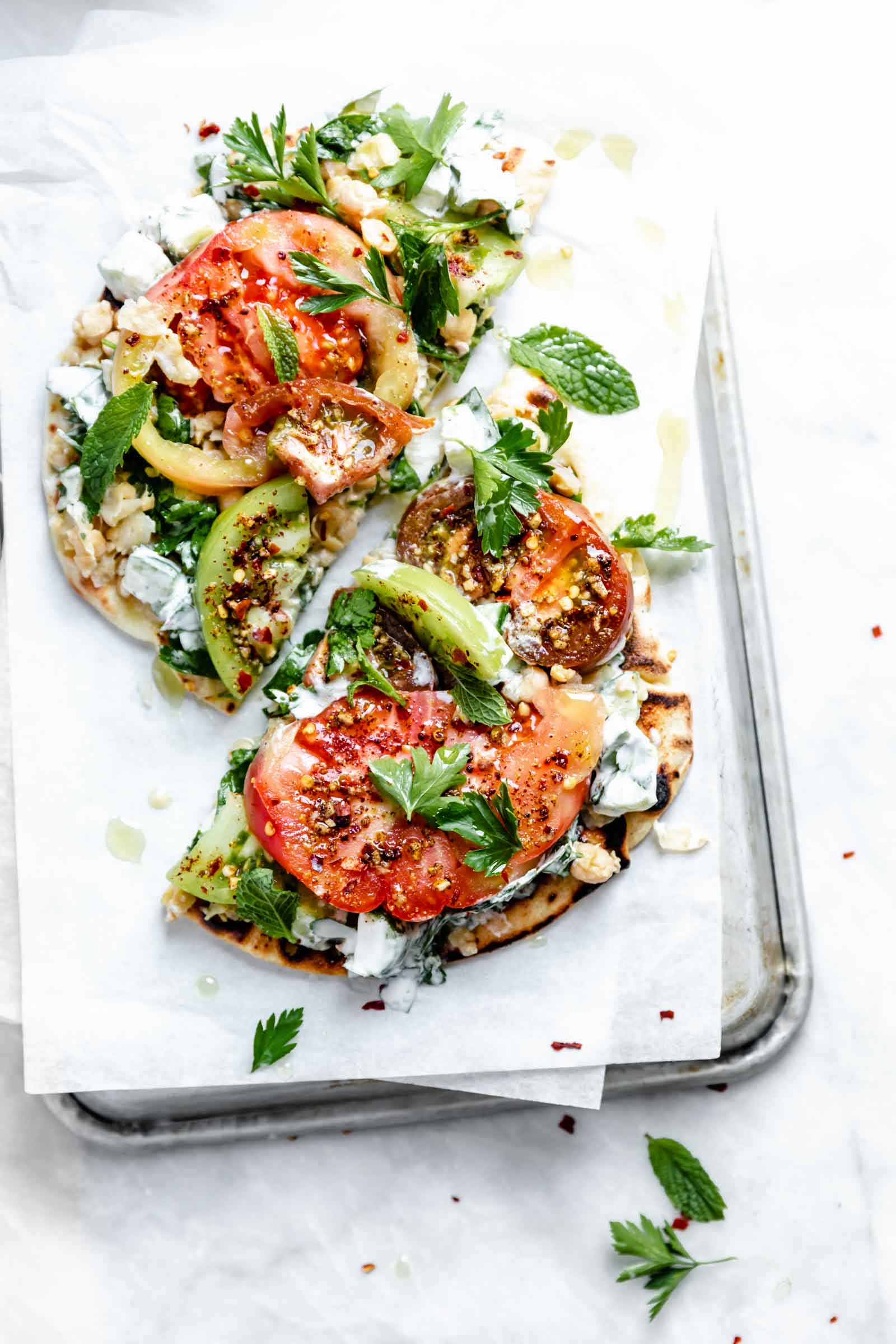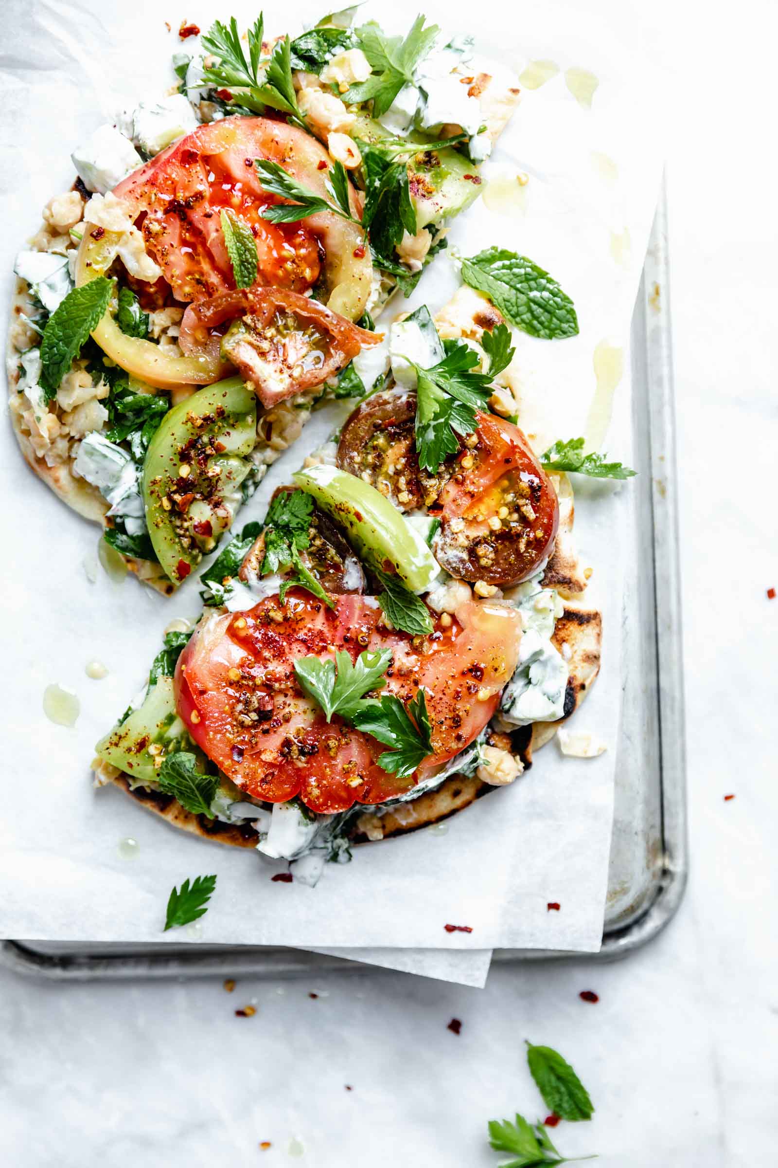 Boy oh boy, do we have a good one for you guys today. Introducing Falafel-Spiced Tomato and Chickpea Flatbread to use up all those fresh heirloom tomatoes. Picture this: perfectly grilled homemade naan bread topped with a tangy cucumber yogurt sauce, smashed chickpeas, and perfectly spiced heirloom tomatoes. Can I get a HECK YEAH?! This flavor and texture explosion is exactly what you need for dinner tonight.