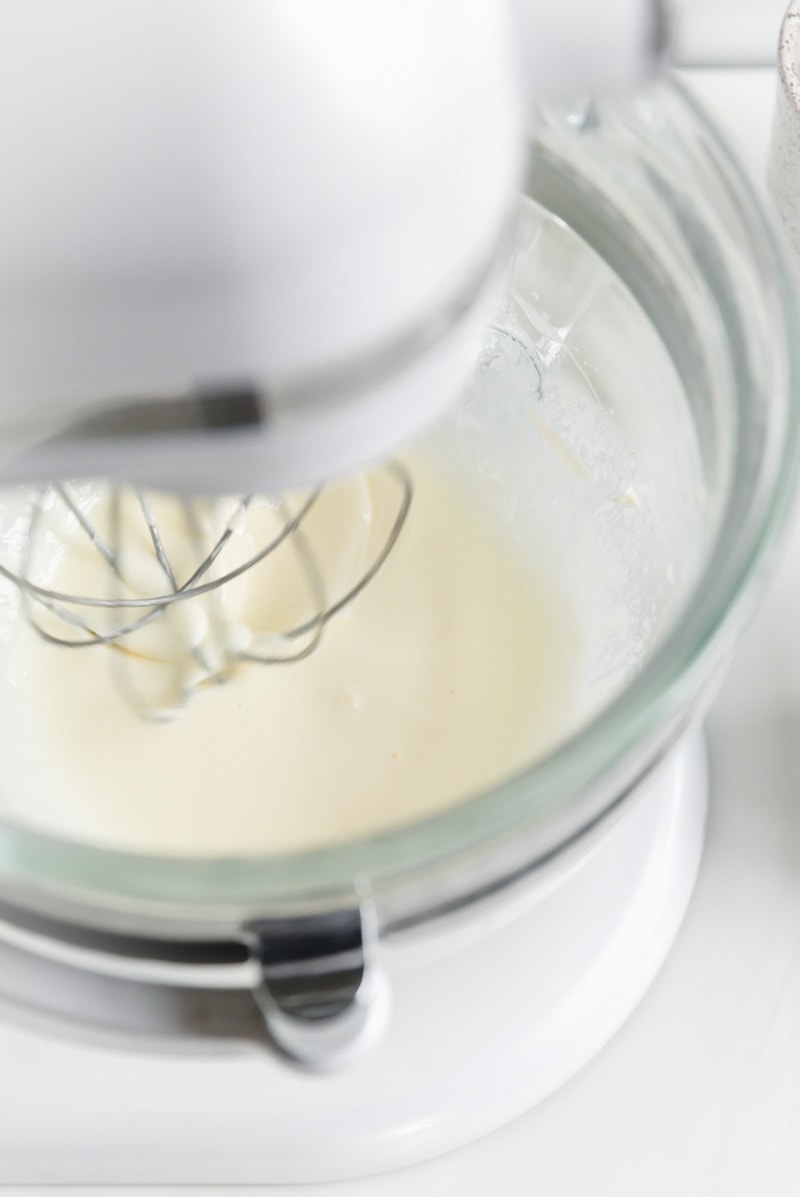 - After all the eggs are in, add in that high quality vanilla (so worth it), and beat the mixture for another 3 minutes until it becomes pale yellow and you see little bubbles form on the top of the batter.