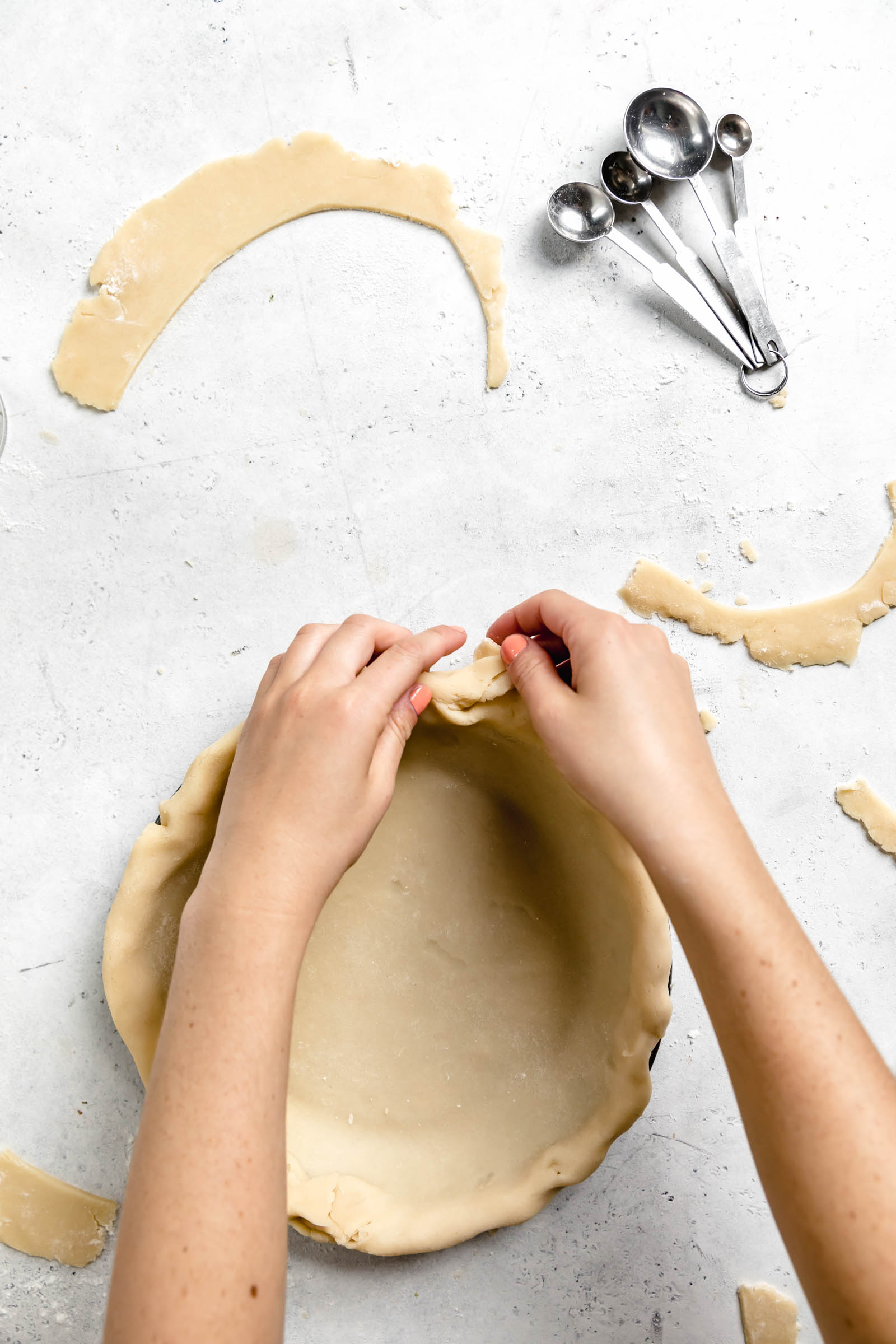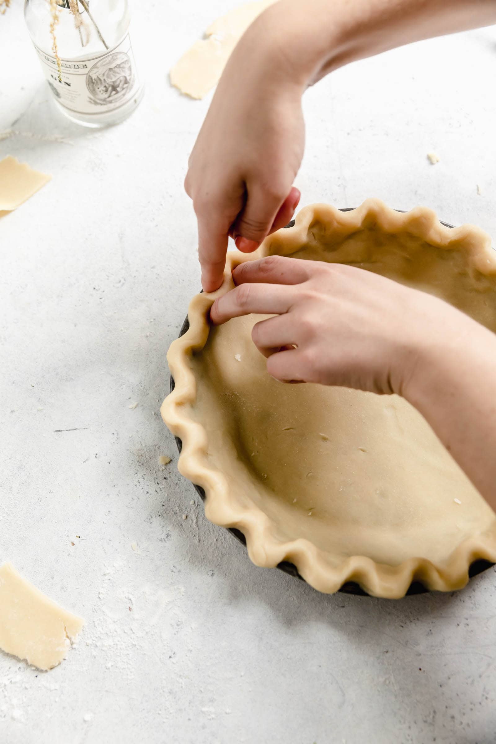 Use both hands to roll the pie dough underneath itself, rolling it up and under towards the pie dish. Repeat this alllll around your pie dish and then use your fingers to seal everything in and even out the crust, so you have a nice even, thick crust to make those beautiful classic pie crimps.