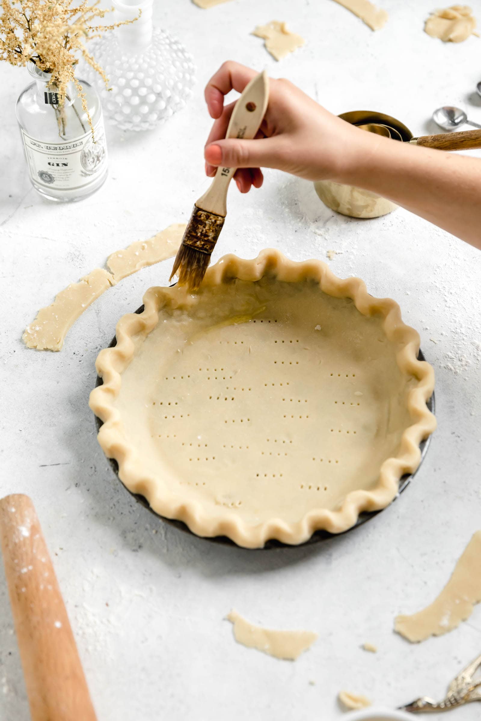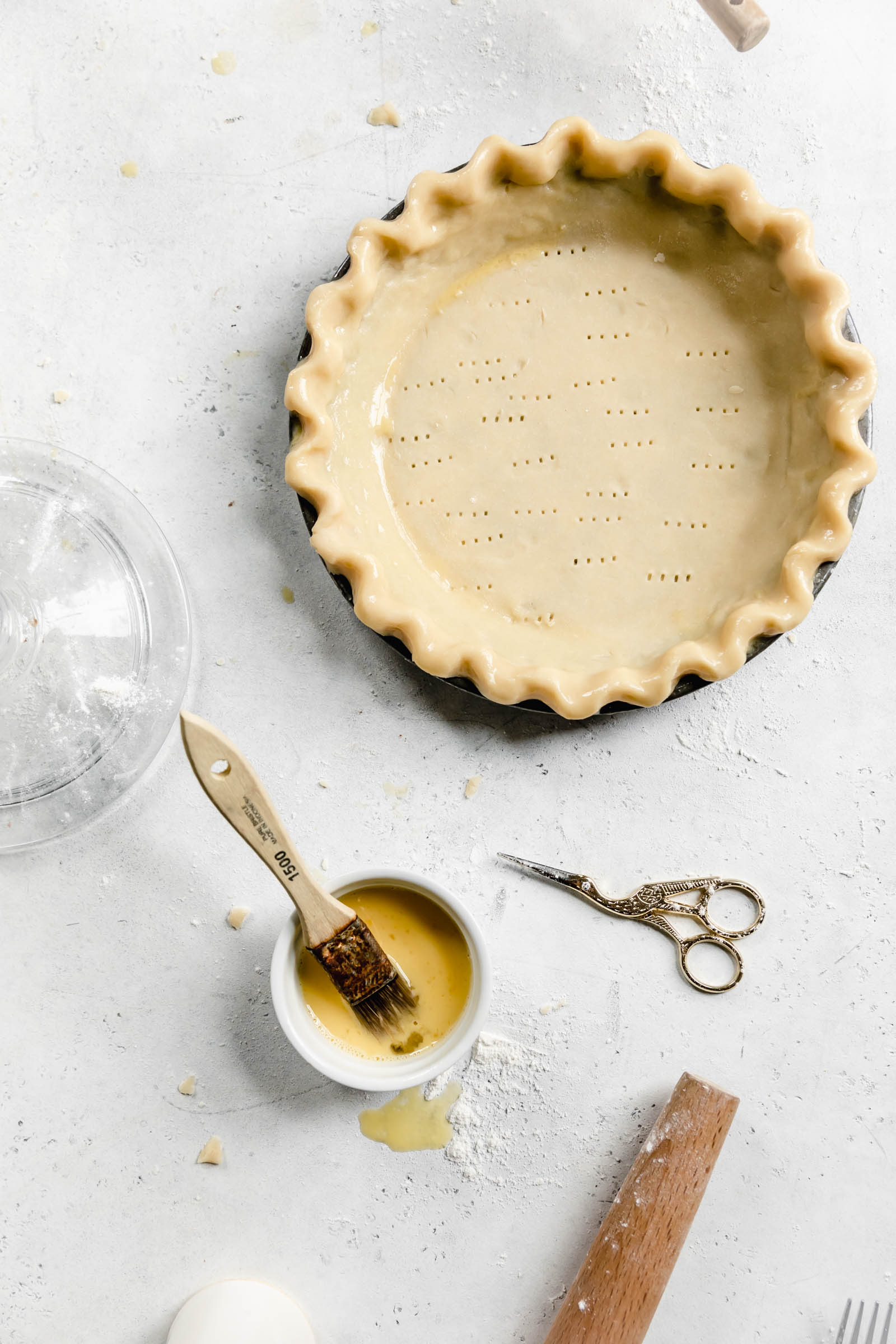 - In a small bowl whisk together an egg and a teaspoon of water. Use a pastry brush to brush the edges of the pie crust. Last, use a fork to poke a few holes in the bottom of the crust to prevent any air bubbles from forming. Use with your favorite pie recipe!