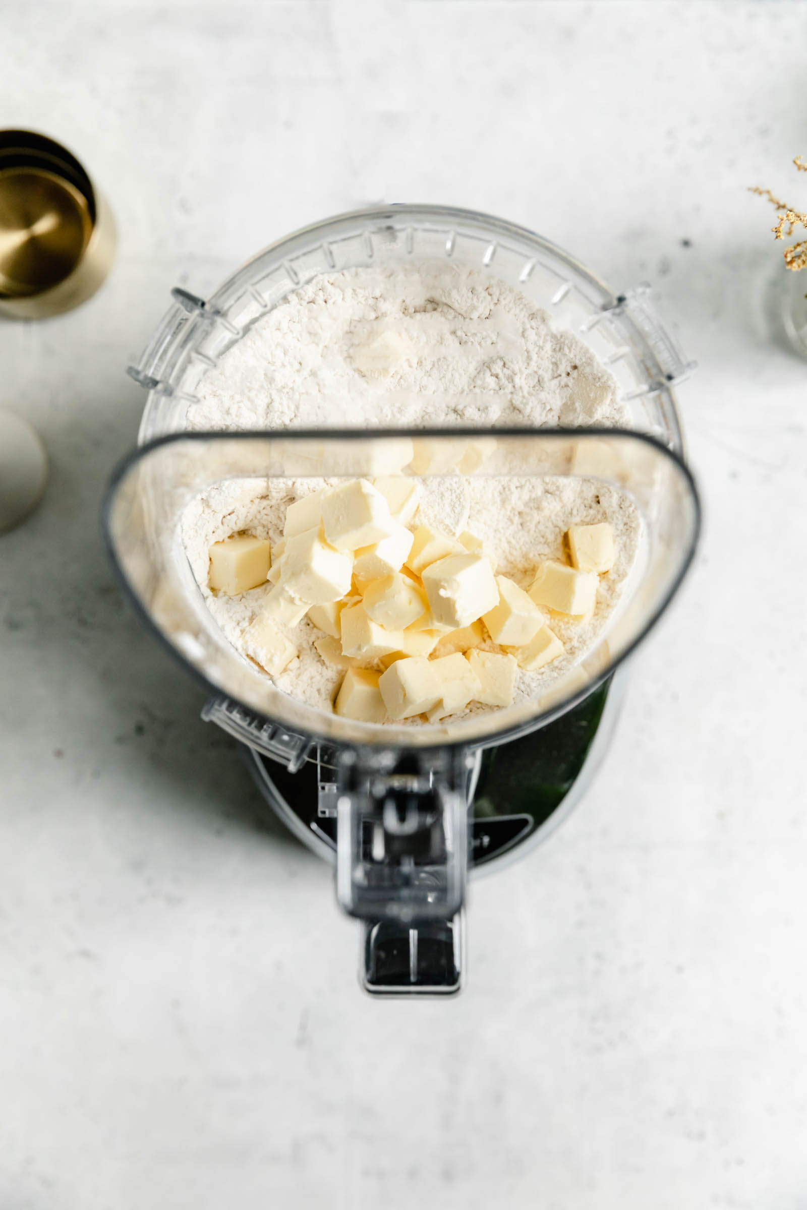 - Place the flour, sugar, and salt in a food processor. Add the cold butter cubes to the food processor and pulse until the mixture resembles wet sand and no large chunks of butter remain.