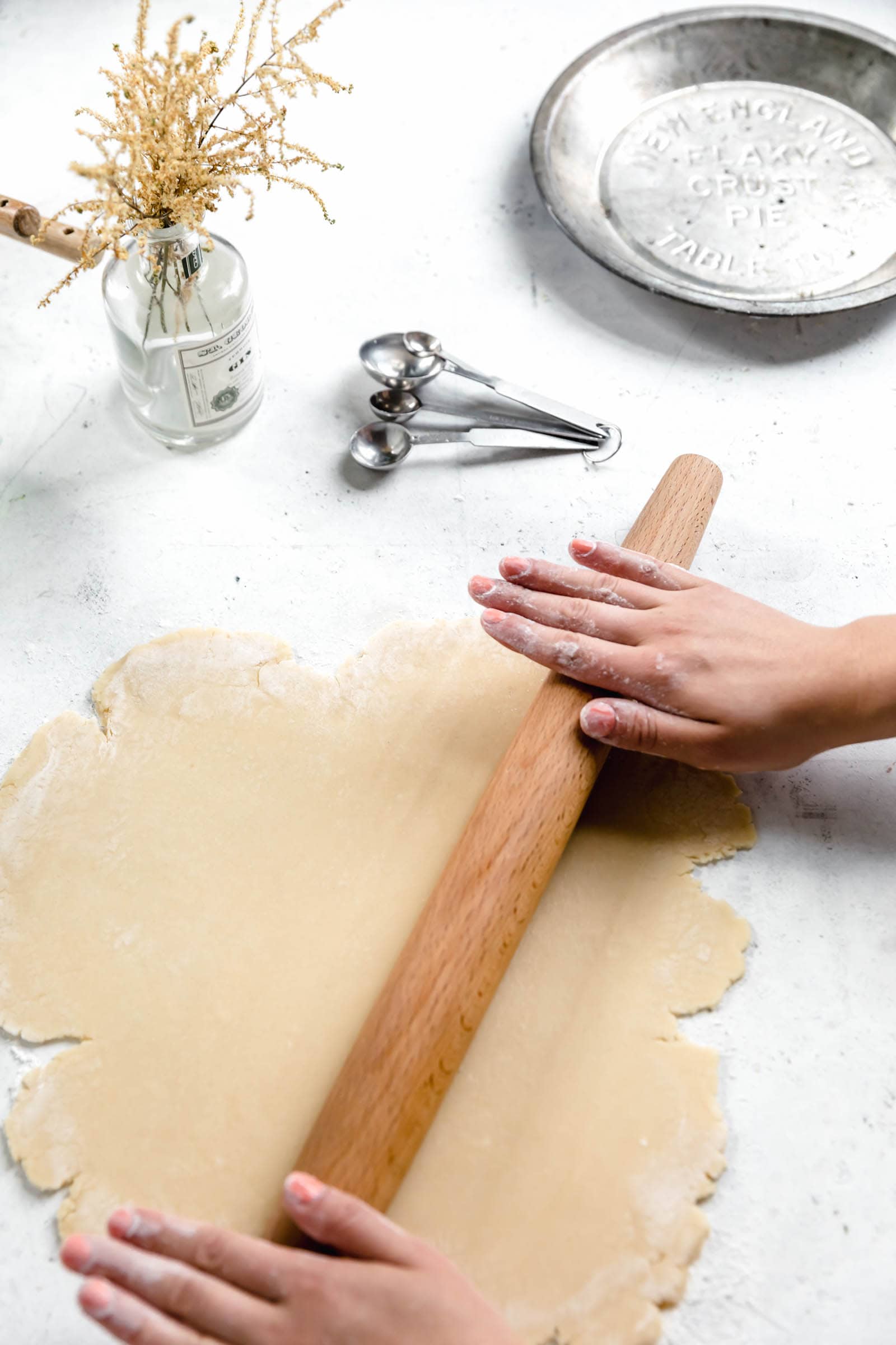 Place your rolling pin at the edge of your dough circle. Peel up the top of your dough and wrap it around your rolling pin. Rotate the rolling pin as you continue to peel up the pie dough. Repeat until the dough is fully wrapped around the pin. Then unroll the dough over your pie dish and ta da! No ripped or torn pie crusts here!