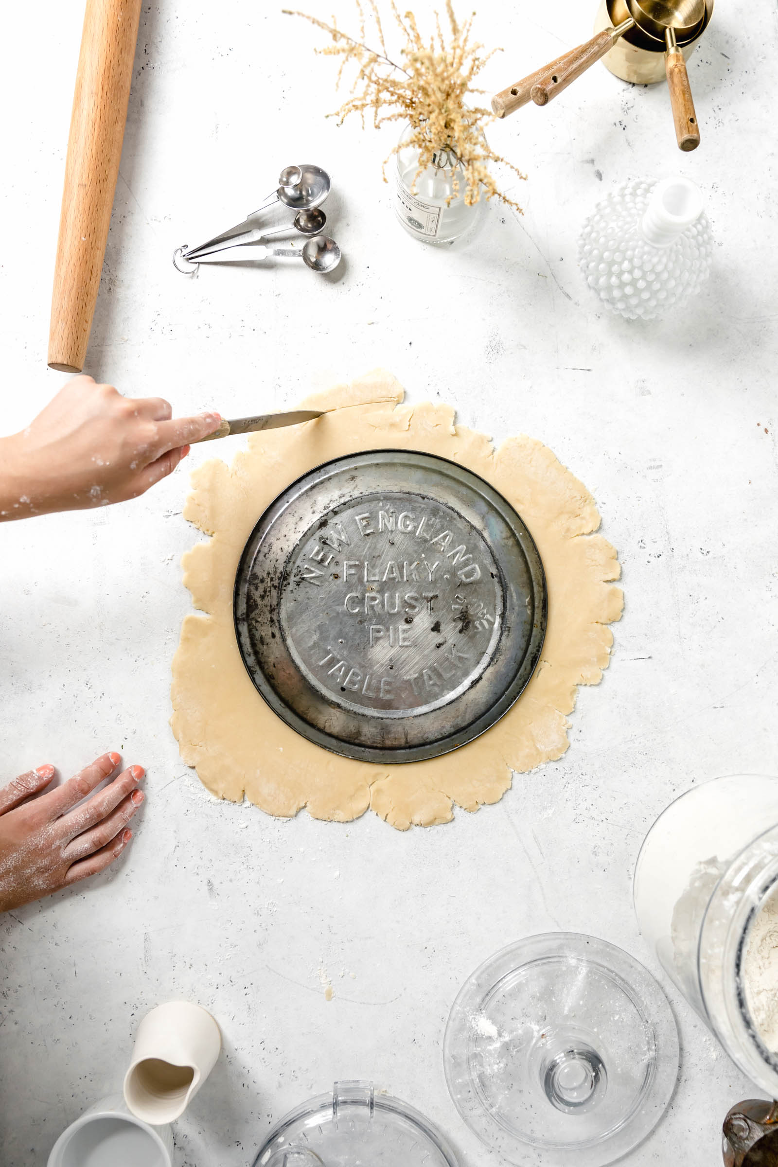 Step Six: Place pie dish facedown on top of your dough and cut a circle two inches wider than it
