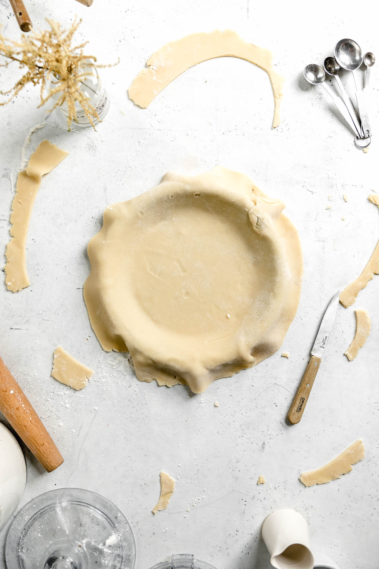 - When you’re ready to make your pie, turn the dough out on a floured surface and roll out into a large circle to about an 1/8th of inch thickness. Place the pie dish face down onto the dough circle and use a sharp knife to cut a border 2 inches wider than the pie dish.
