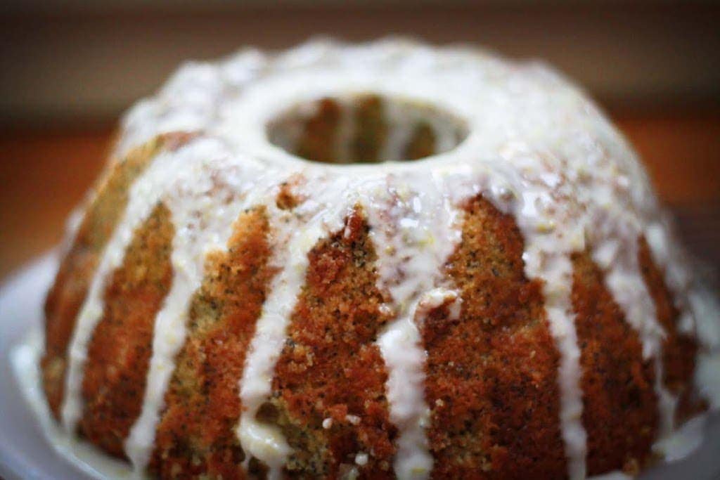 - Preheat oven to 325°F. In a large bowl, mix flour, baking powder, baking soda, and salt. In a second bowl, mix butter, milk, eggs, sugar, and vanilla extract. Pour wet ingredients into dry ingredients, and stir until mixed. Add poppyseed and the juice and zest of one lemon, stirring until just combined. Pour the mixture into a large, greased bundt-pan. Bake for roughly 35 minutes, until a knife comes out clean when inserted into the cake.