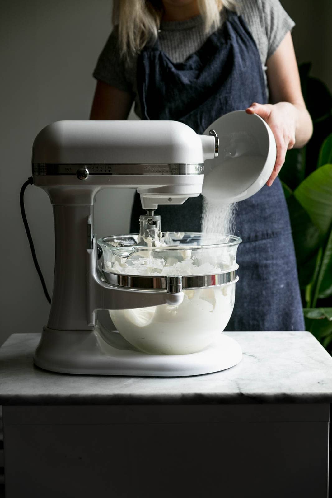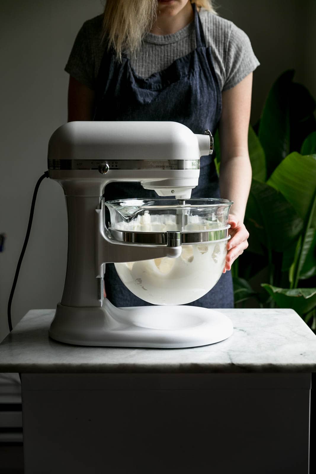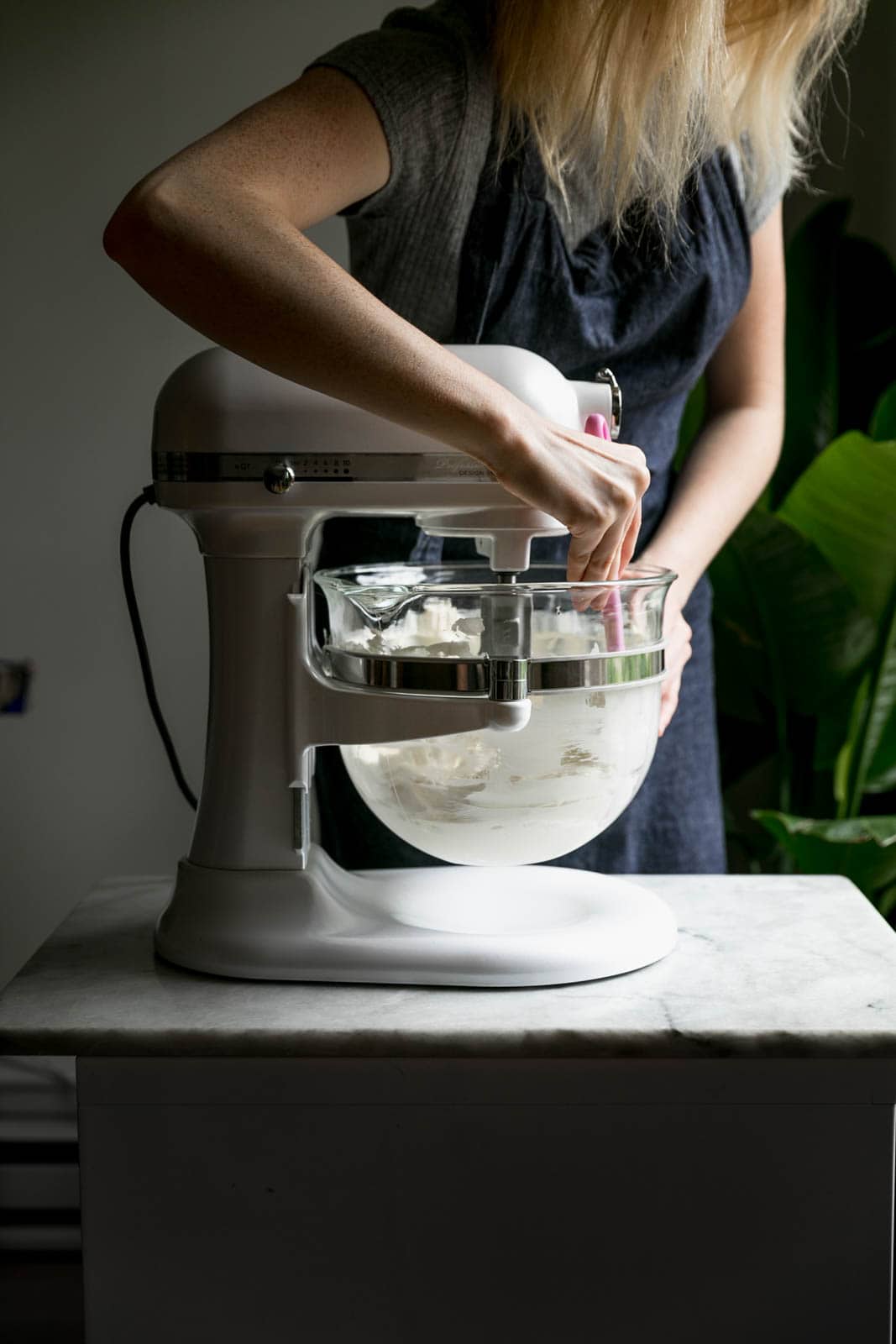 - In a standing mixer fitted with a paddle attachment, cream the cream cheese over medium-low speed for 2 minutes. Do not use a higher speed, or you will incorporate too much air into the batter. Scrape the cream cheese from the sides of the bowl halfway through mixing.