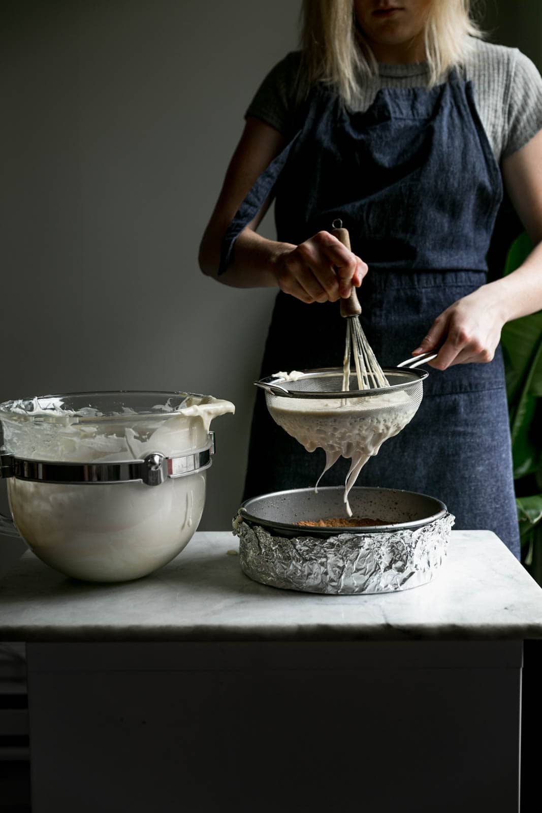 Another trick to perfect cheesecake is straining your cheesecake batter through a fine mesh strainer. This will remove any remaining lumps that would otherwise affect the texture of your cheesecake. We want every last bite of our cheesecake to be smooth AF, so this step ensures that!