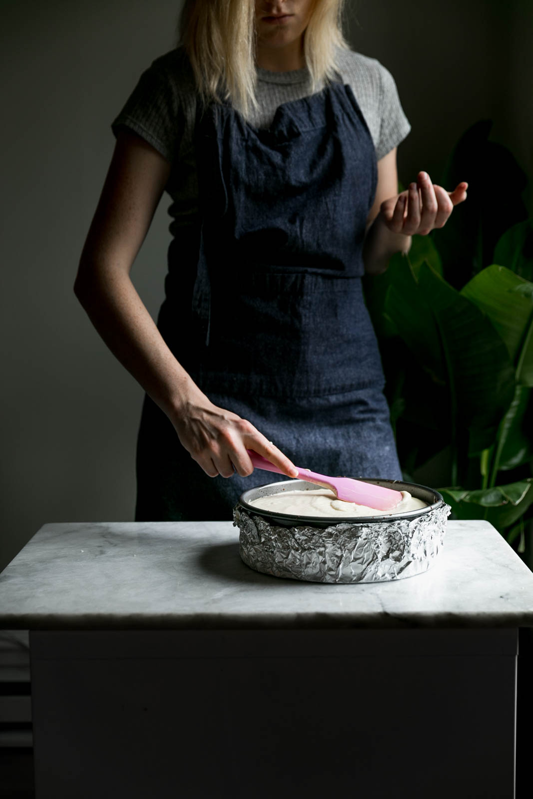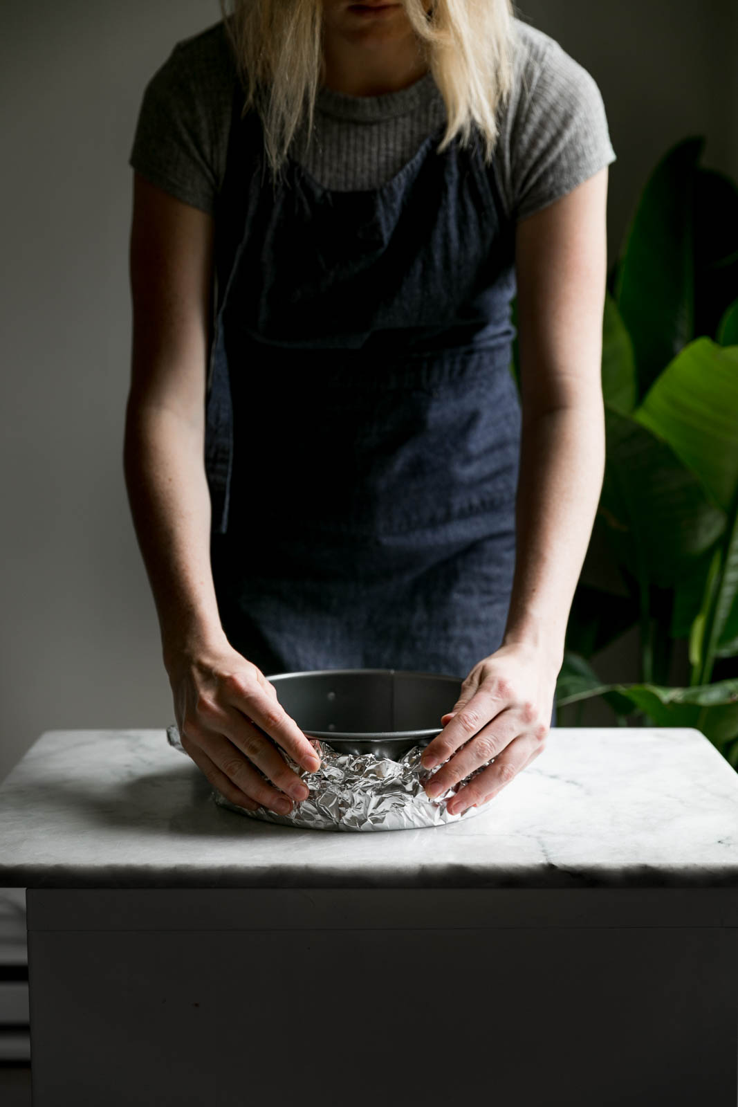 First off, it’s super important to tightly wrap your springform pan with tin foil. This will prevent leakage, and act as a double insulation for your cheesecake.