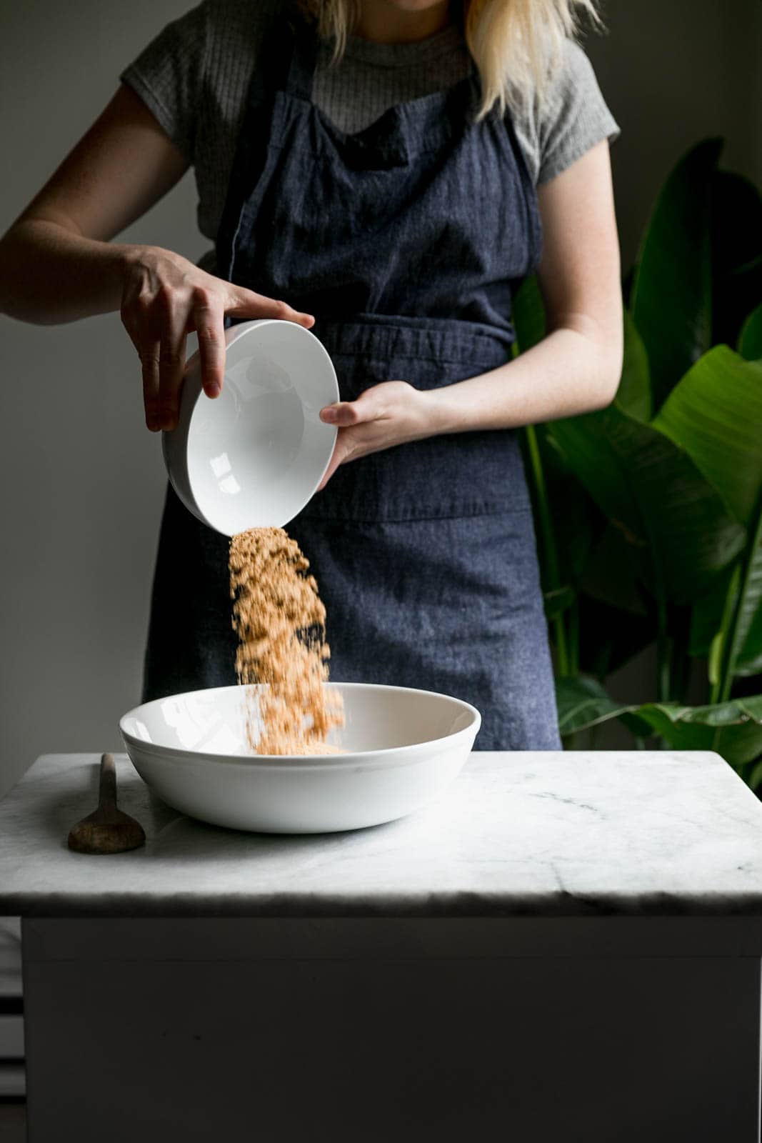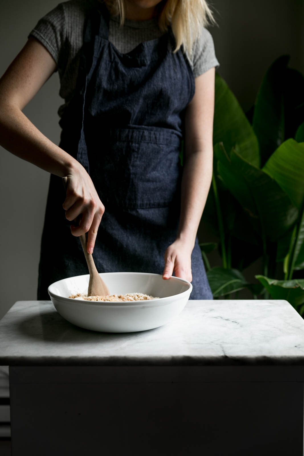 - Using your fingers, break up mixture into prepared pan. To create an even crust, create an even layer of crust using about 2/3 of the mixture, then scatter the remaining mixture around the edges, creating a lip. Firmly pack crust into pan, pushing it up the sides just slightly.