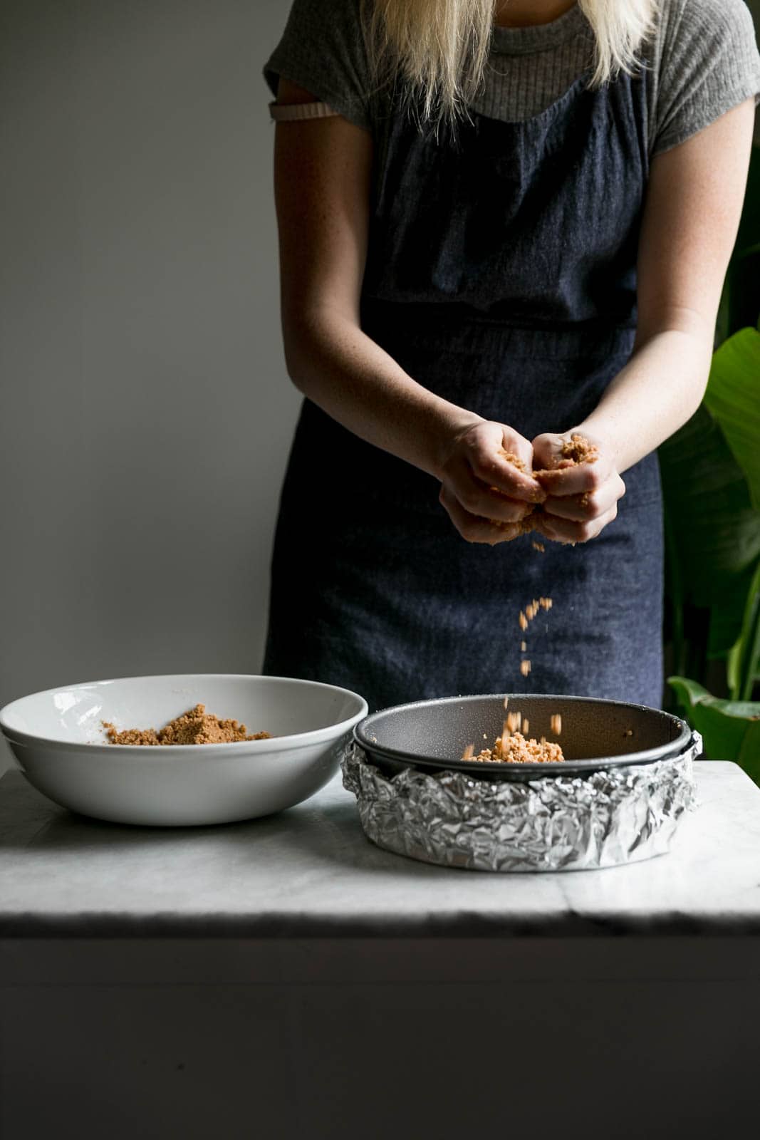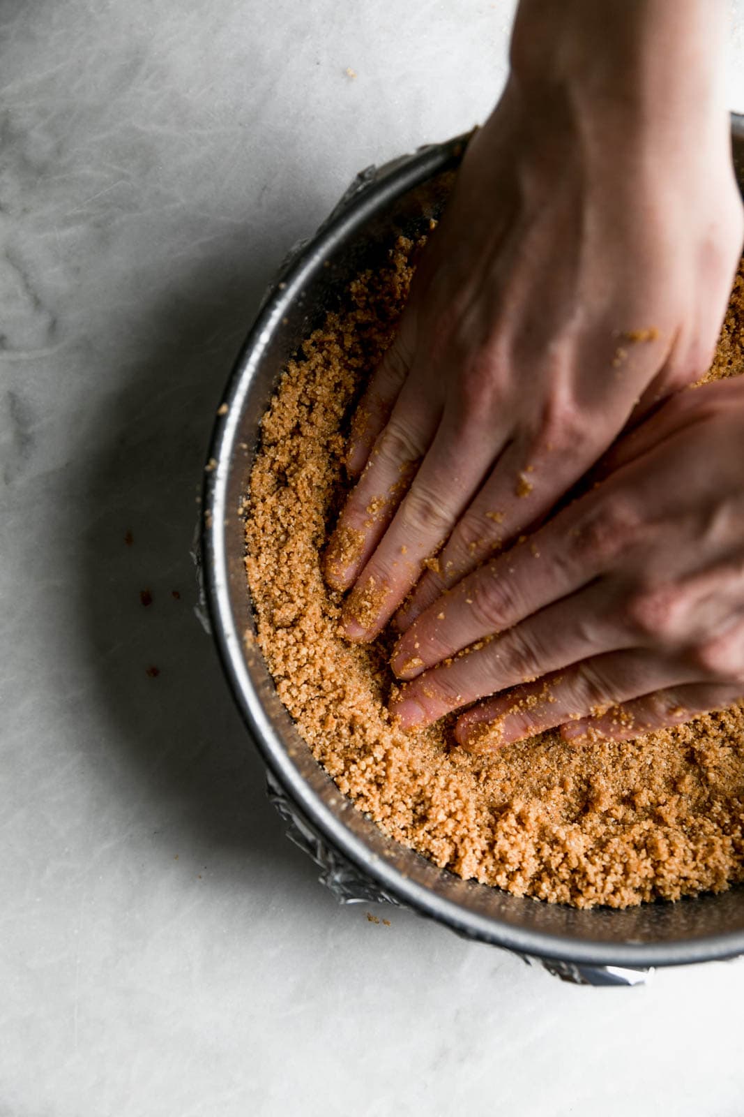 Ever wondered how to get those perfectly even walls of graham cracker crust for your cheesecake? I do what I call the break and pack method. Once your crust is well combined, break it into your springform pan so it looks like unpacked wet sand. Then, using your fingers in a light patting method, create a ring around the outside of your crust (see below!). Then begin to pack your crust down.