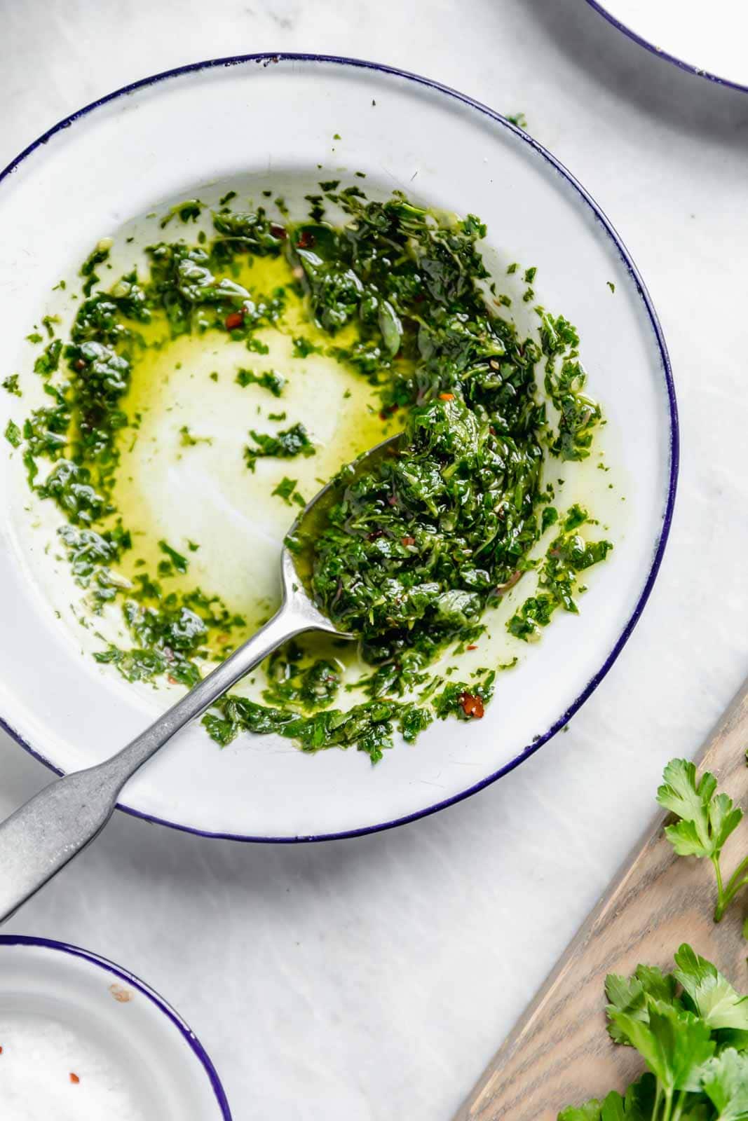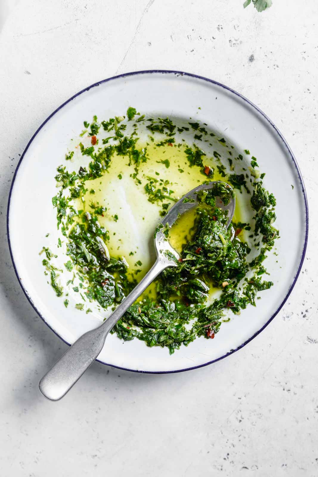 Chimichurri is an herby, flavorful green sauce made in Argentinian and Uruguayan cuisine. It’s usually made with chopped parsley, oregano, garlic, olive oil and red wine vinegar, and is traditionally served with grilled meats. I especially like it on this chimichurri steak salad. 🙂