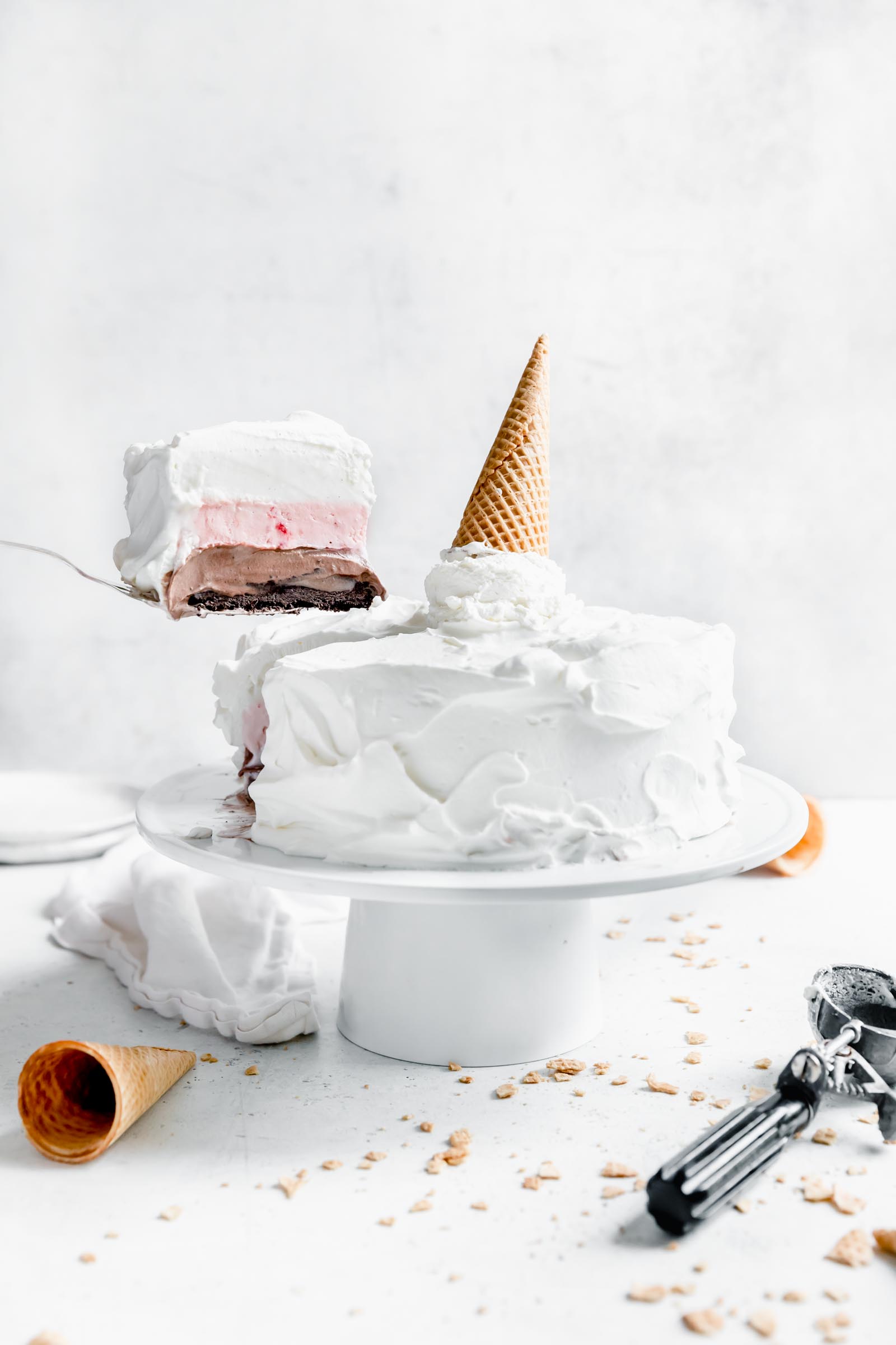 - Using a large offset spatula or a metal spoon, liberally frost the cake with the whipped cream, making big swirls and covering the top and sides of the cake. If you want the cute ice cream cone on top, take a cookie scoop and scoop a single ball on top of the frosted cake. Garnish with a cone. Serve right away or keep in the freezer for up to 1 week. Enjoy 🙂