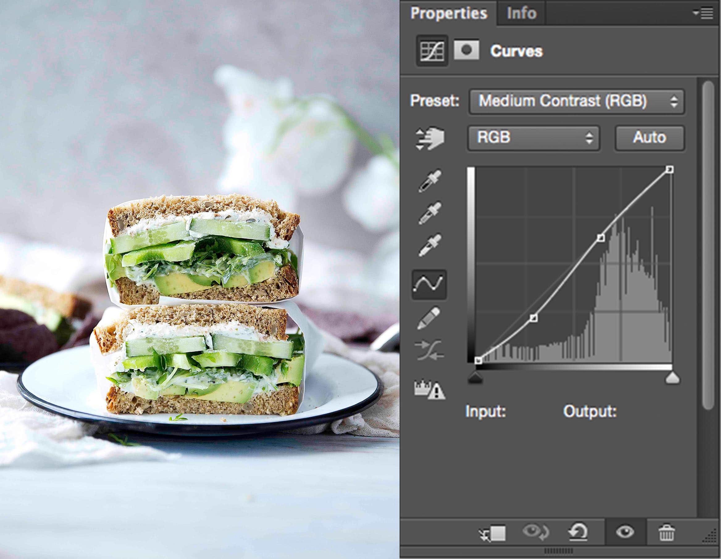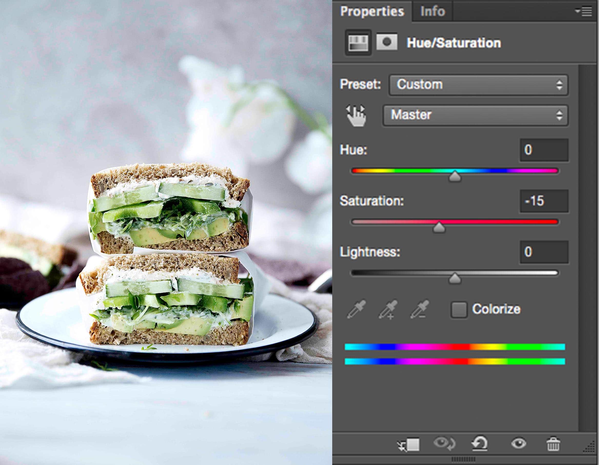 We’re almost there! Now let’s tackle that saturation issue. I love the contrast we’ve added in, but our colors have suffered a bit. The image looks way too saturated. The greens are bright bright bright and the bread looks more yellow than beige. So let’s pull out some of that color.