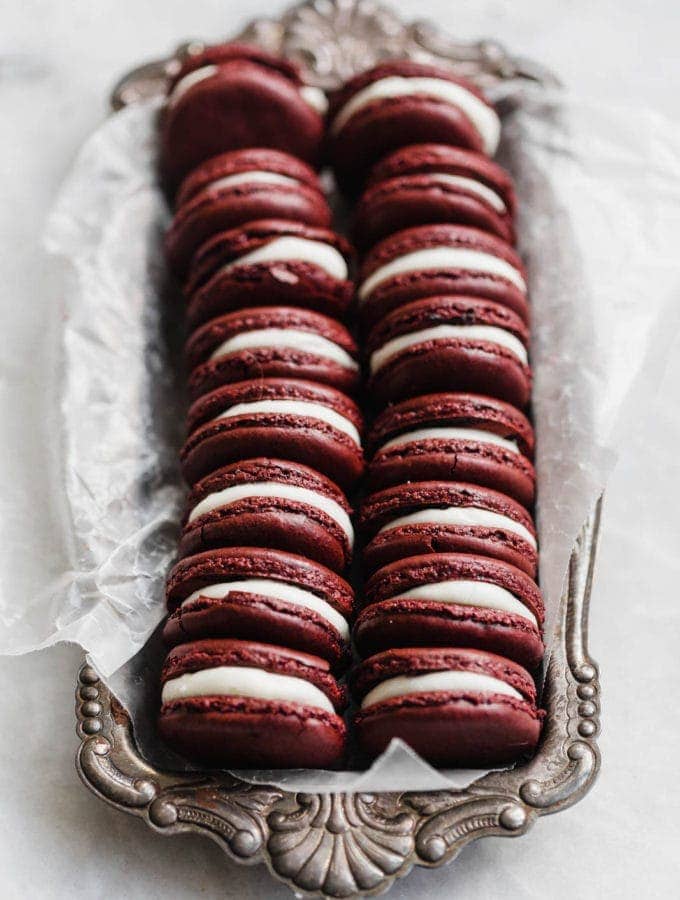 Red velvet macarons + cream cheese frosting is a true match made in heaven. I mean, who doesn’t love a good macaron? Especially when they are this gorgeous. Â