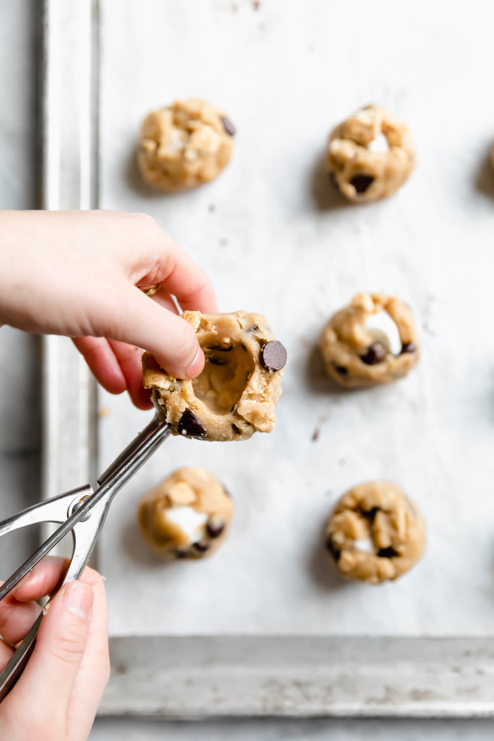 - Scoop out the cookies using a 1 ounce cookie scoop. Place your thumb in the middle to form a cavity and place half a marshmallow inside. Release the ball from the cookie scoop and roll together so that the marshmallow is covered. Repeat with remaining dough. Refrigerate cookie dough balls for at least 1 hour or up to overnight.