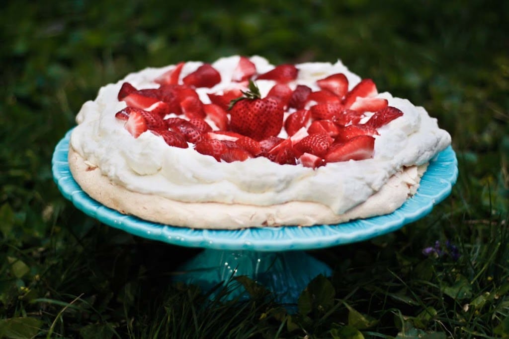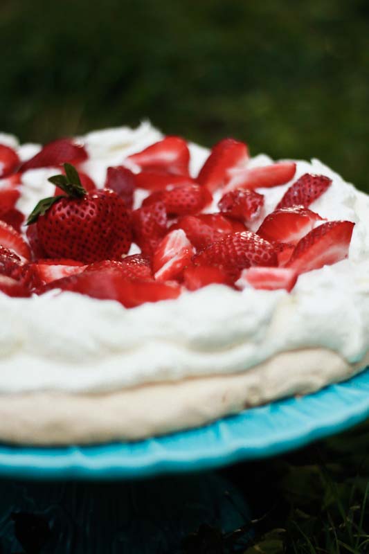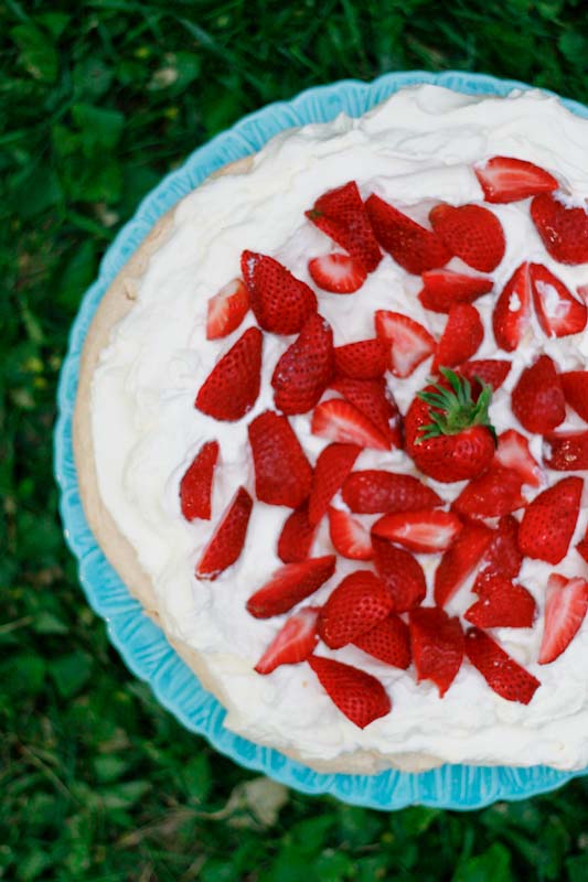 - While the meringue is baking, whip up the topping! Combine all ingredients (minus the strawberries) in a large bowl and whip until a hard whipped-cream consistency is reached. Spread over the meringue once ready and top with strawberries. Voila!