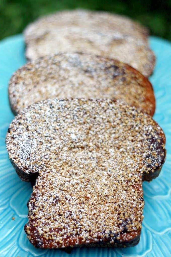 - Using a cup measurer, pour 1/4 cup of simple syrup onto each slice of bread, coating the bread evenly. Next, spoon about 3 tablespoons of tahini spread onto each slice, again spreading evenly to coat. Last, sprinkle the entirety of the sesame seeds over each slice. Bake on a well-greased cookie sheet for 30 minutes on one side, then flip and bake for another ~30 minutes, as needed. The goal is to get both sides nicely toasty and golden brown. Allow to cool on a wire cooling rack, then sprinkle with the confectioner’s sugar and serve!
