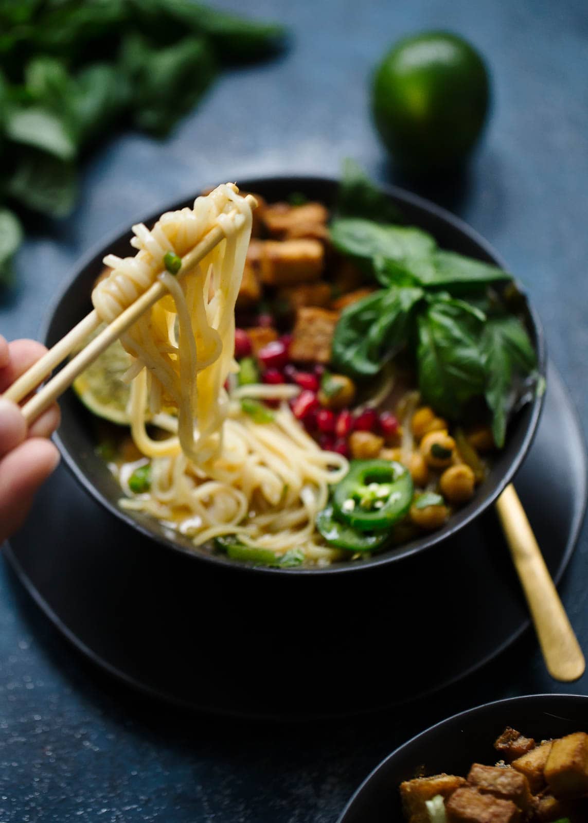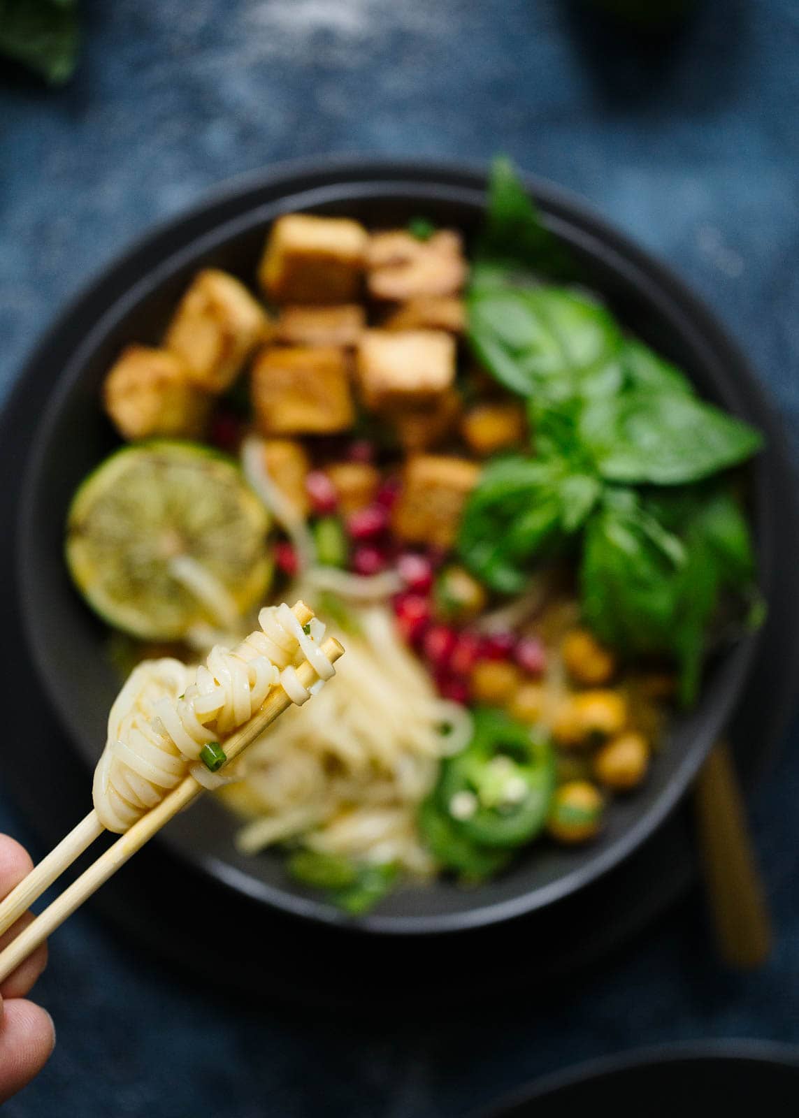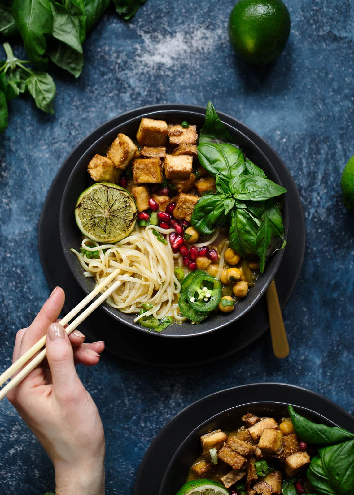 - To plate your soup, place a healthy serving of rice noodles into a soup bowl. Top with soup, then arrange tofu, basil, cilantro, jalapeño, pomegranate seeds, and lime all around the edge of the bowl. Serve!