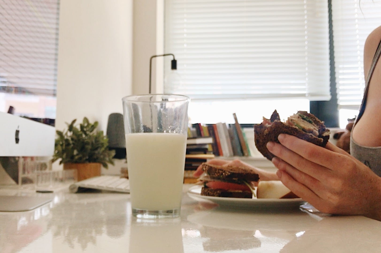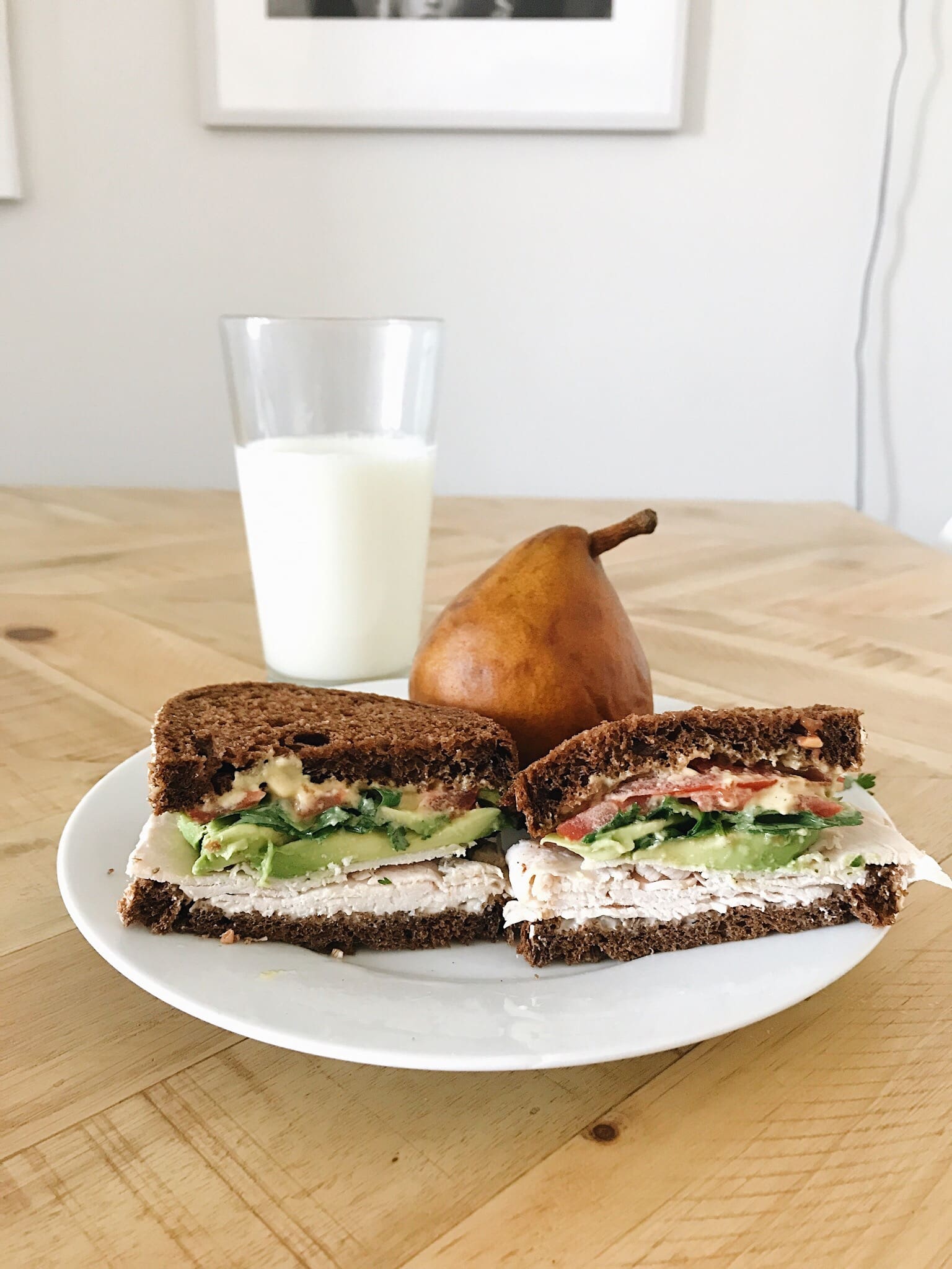 I typically have the same lunch every day. I’ve been eating turkey sandwiches for lunch since I was a little kid– just ask my mom! My current turkey sandwich includes an in-house roasted rosemary garlic turkey with low fat canola mayo, dijon mustard, heirloom tomatoes, avocados, and cilantro on pumpernickel. I love eating it with a glass of skim milk or almondmilk and fruit.