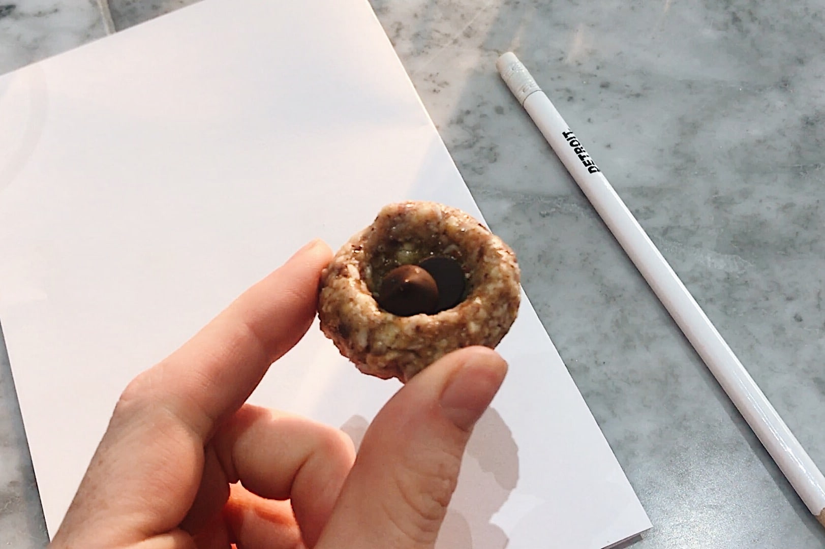Earlier in the day I had made the most amazing Marcona-style almonds using Blue Diamond’s whole natural almonds. They ended up as part of a gorgeous cheeseboard (which has since been posted on the site!) that I took to an evening meeting with girlfriends. Since I had already eaten a lot of cheese for dinner, I snacked on a few slices of pear and a raw cookie bite.